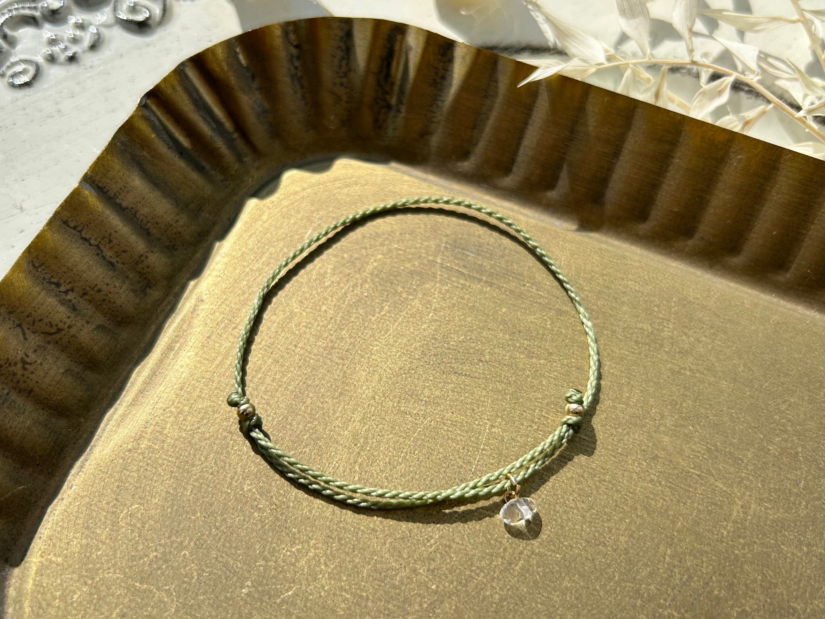 シンプルな編紐ですが、ひとつぶの水晶がクリアなきらめきとツヤをプラスしてくれています。